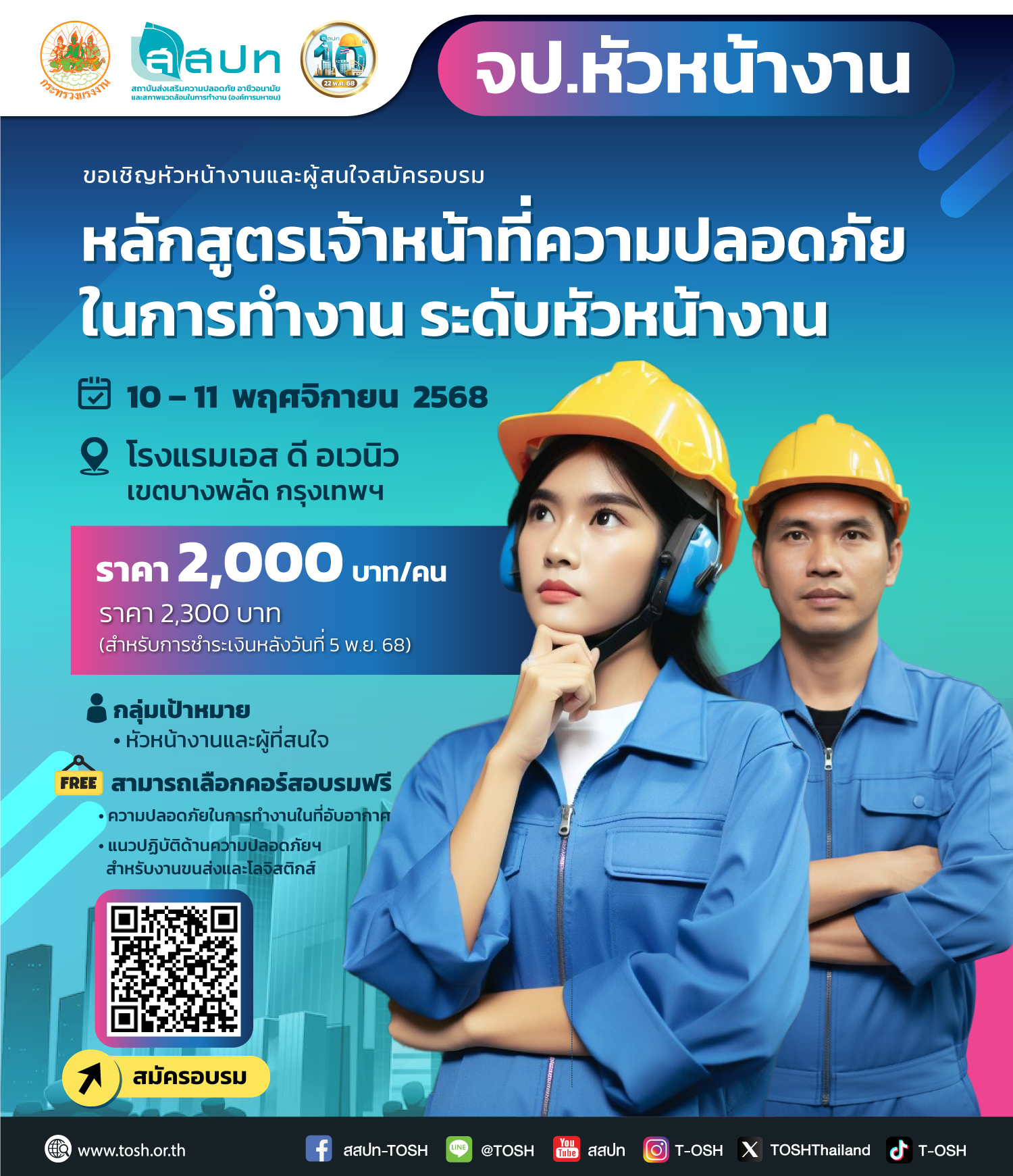 * ลงทะเบียนและชำระเงิน หลังวันที่ 5 พ.ย. 2568 ราคาเต็ม 2,300 บาท แต่ให้เลือกคอร์สอบรมฟรี เพียง 80 ที่นั่ง (อับอากาศ 40 ที่นั่ง และโลจิสติกส์ 40 ที่นั่ง)